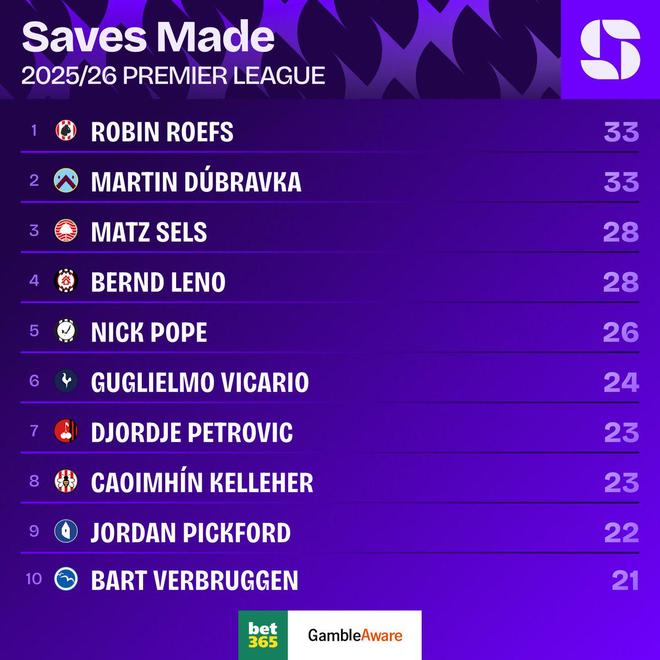 桑德兰门将罗埃夫斯扑救数暂列英超第一,扑救成功率联赛第二
