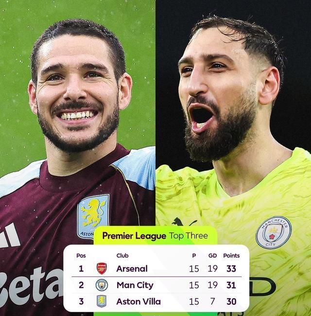 至此,阿森纳仍积33分领跑英超积分榜,但领先优势已缩水至2分,争冠压力陡增。曼城凭借一波3连胜积31分来到第2,阿斯顿维拉积30分位居第3仅差榜首3分,形成了三足鼎立的争冠态势!
